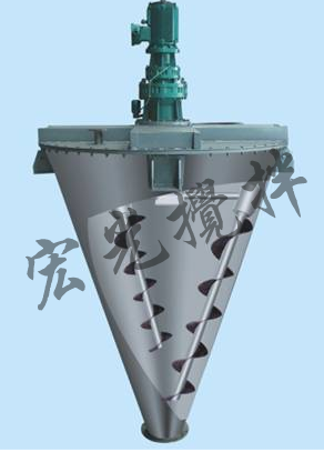 單錐雙螺旋錐形混合機,它由傳動部分、筒蓋、螺旋、筒體、出料閥等組成。